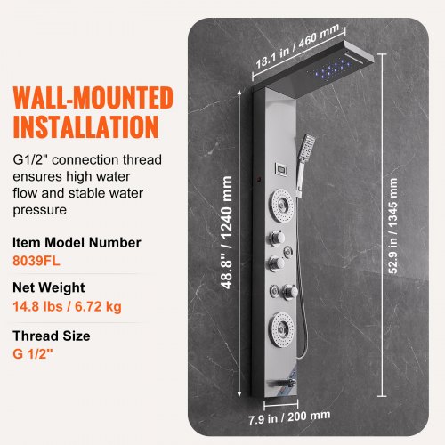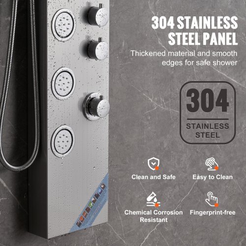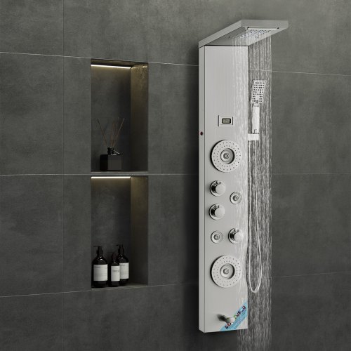VEVOR Sistema Pannello Doccia, 6 Modalità Doccia, LED e Display Pannello Doccia Torre, Pioggia, Cascata, Bocca per Vasca, Soffione Doccia a Mano, Tubo da 150 cm, Set Doccia a Parete in Acciaio Inox