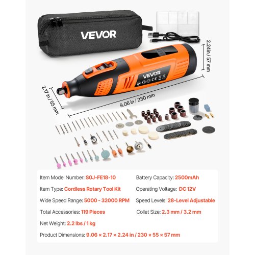 VEVOR Kit di Utensili Rotanti Senza Cavo 181 Pezzi Portatile 5000-25000 giri/min per Smerigliatura Levigatura Perforazione Taglio, Kit Multiutesile Rotante per Taglio Incisione Lucidatura 5 Velocità
