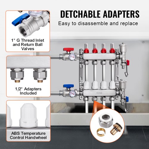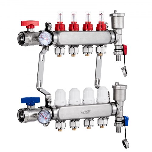 VEVOR Collettore di Riscaldamento Radiante a 4 Rami, Collettore per Tubi PEX da 12,7 mm in Acciaio Inossidabile PEX, con Adattatori da 12,7 mm, per Pavimento Radiante Idronico, Kit Collettore PEX