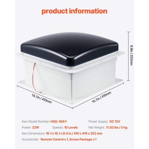 VEVOR Ventilatore di Sfiato per Camper da 35,6 cm 12 V Ventilatore da Tetto per Camper, 10 Velocità con Telecomando, Motore CC Integrato, Coperchio Superiore Elettrico, Pala del Ventilatore da 30,5 cm
