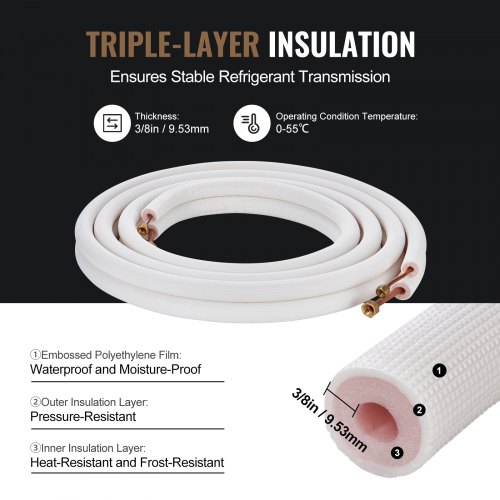 VEVOR 25FT Mini Split Line Set, tubi in rame con diametro esterno da 1/4" e 1/2" e isolamento a triplo strato per aria condizionata pompe di riscaldamento e HVAC