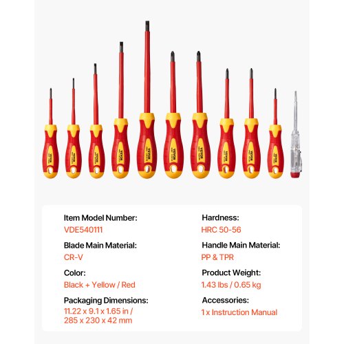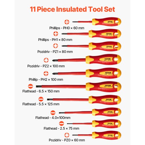 VEVOR Set di Cacciaviti Isolati 11 Pezzi, Set di Cacciaviti Elettrici 1000 V Set di Utensili per Elettricisti Isolati, Punte Magnetiche a Taglio Phillips e Pozi, Tester di Tensione, per Elettricisti