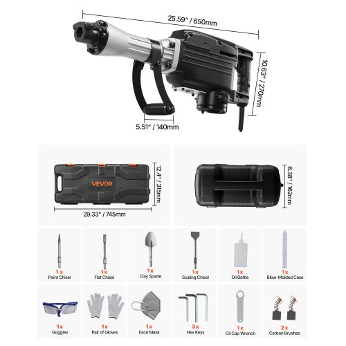 VEVOR Martello Demolitore per Calcestruzzo 3500W 2 Punte a Scalpello per 1900BPM, Kit di Martello Demolitore Elettrico 220V per Lavorazione su Cemento Mattoni Piastrelle Demolizione per Muro 60J 3500W