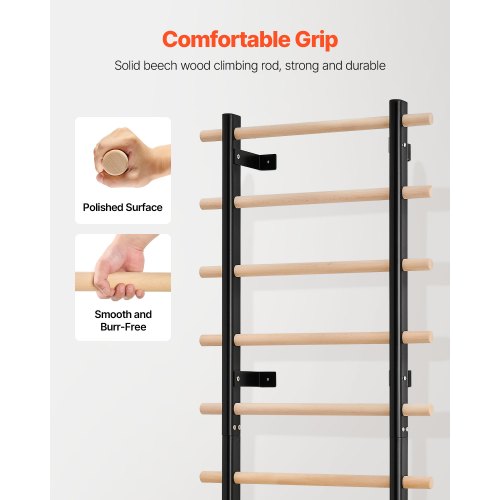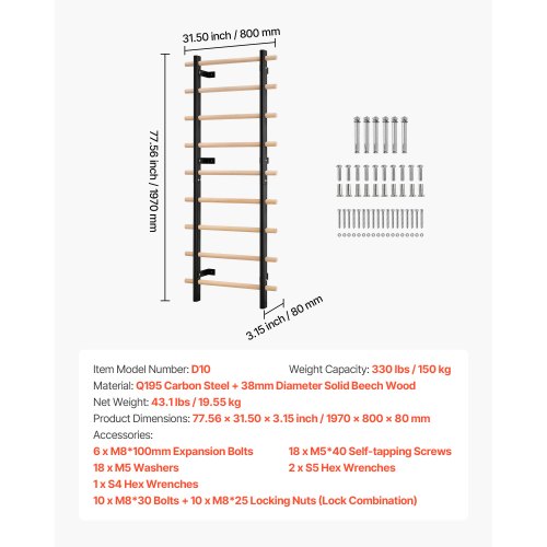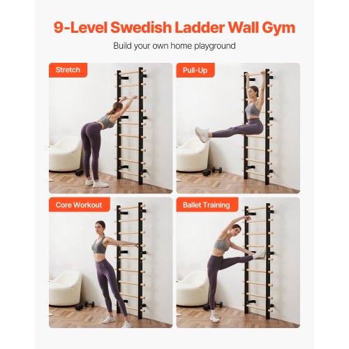 VEVOR Scala Svedese da Parete, Carico 150 kg Scala per Ginnastica a 9 Livelli, Barre per Stalli da Ginnastica in Legno Massello e Acciaio al Carbonio, per Accessori Cremagliera di Potenza 80 x 80 mm