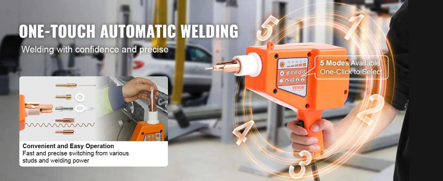 Migliora la riparazione delle ammaccature della'auto con la saldatrice a punti VEVOR 800W. Le 5 modalità di saldatura di precisione, funzionamento intuitivo, opzioni di applicazione versatili,