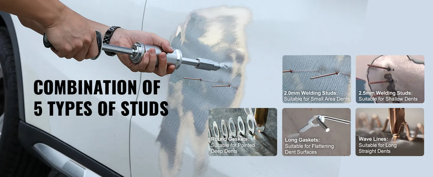 Questo kit per la riparazione delle ammaccature fornisce gli accessori, tra cui martello a slitta, 500 pezzi di perni di saldatura da 2,0 mm, 500 pezzi di perni di saldatura da 2,5 mm, guarnizioni rotonde, linee d'onda e altro ancora.