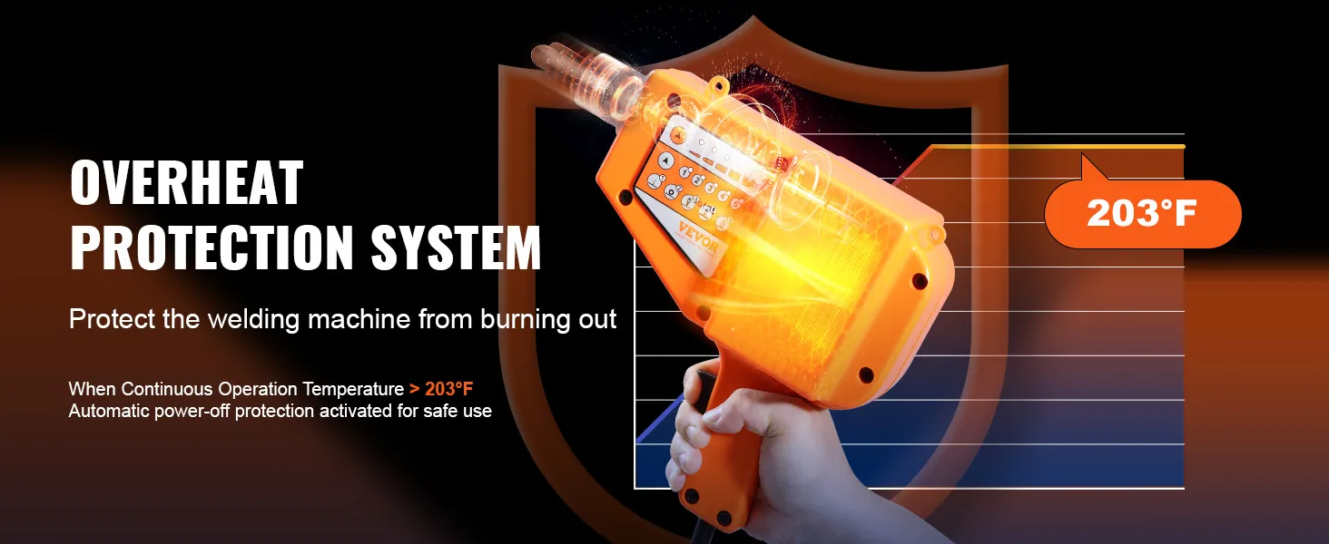 Protezione dal Surriscaldamento migliorata: la saldatrice a punti per carrozzeria è dotata di un sistema di protezione dal surriscaldamento intelligente che inizia a 203 ℉/95 ℃ ed evita cortocircuiti e incendi della macchina.