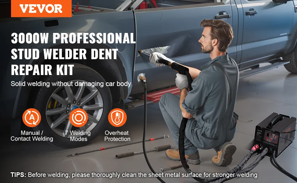 Rimozione professionale delle ammaccature: il kit di estrazione delle ammaccature VEVOR Stud Welder offre una soluzione rapida ed efficiente per rimuovere le ammaccature dai pannelli in acciaio della carrozzeria delle auto, garantendo al contempo un'estrazione precisa delle ammaccature e una forza controllata.
