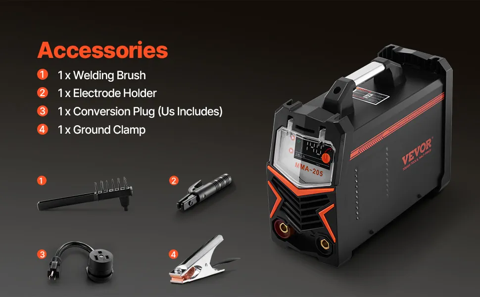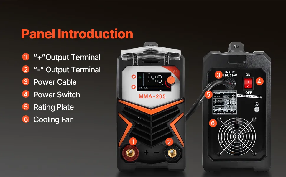 Materiali applicabili: questa saldatrice è ideale per saldare acciaio al carbonio, rame, acciaio inossidabile e titanio. Supporta elettrodi 6010, 6011, 6013 e 7018 e può saldare alluminio da 1/4" e acciaio a basso tenore di carbonio da 3/8". Inoltre, la sicurezza è prioritaria con caratteristiche come VRD, sovracorrente, sovratensione, sovraccarico