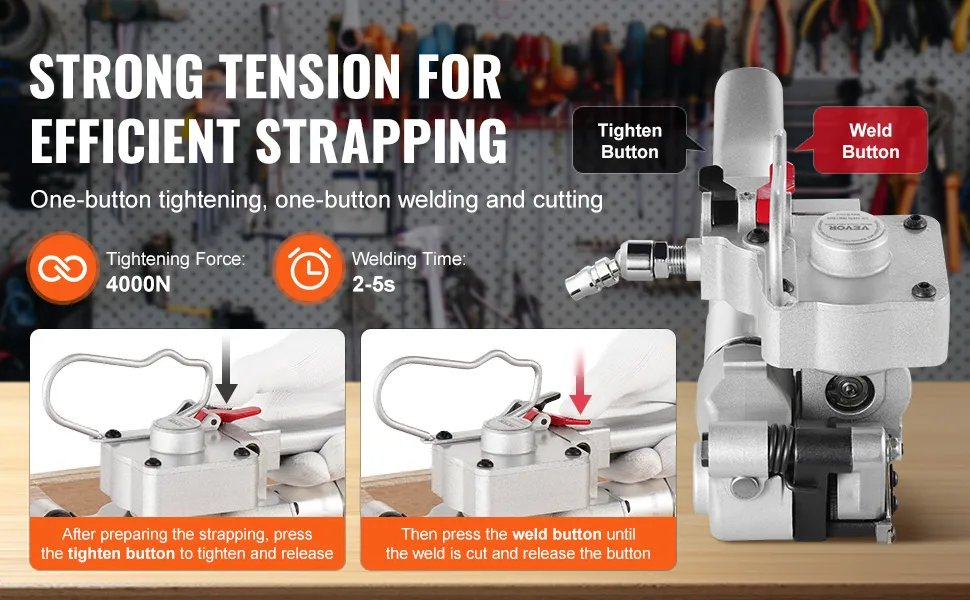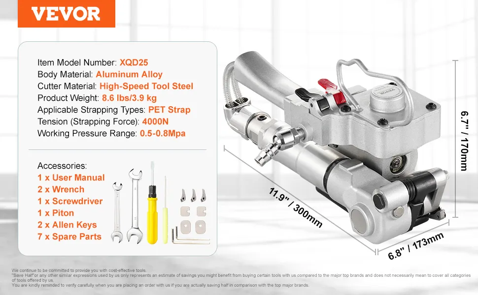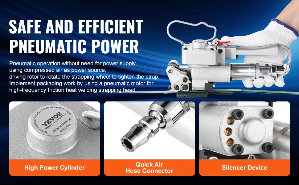 Lo strumento pneumatico per reggiatura VEVOR offre maggiore durata e convenienza, rendendolo un ottimo investimento. Costruito per un uso intensivo, questo strumento può gestire le operazioni quotidiane senza usurarsi rapidamente. Con prestazioni affidabili, riduce la necessità di frequenti sostituzioni o riparazioni. Questa è un'eccellente soluzione per le aziende che dipendono dal fissaggio di carichi pesanti. La durata fa risparmiare tempo e denaro, rendendolo la soluzione perfetta per ogni applicazione di reggiatura. La sua convenienza lo rende un eccellente rapporto qualità-prezzo per aziende di tutte le dimensioni a lungo termine.