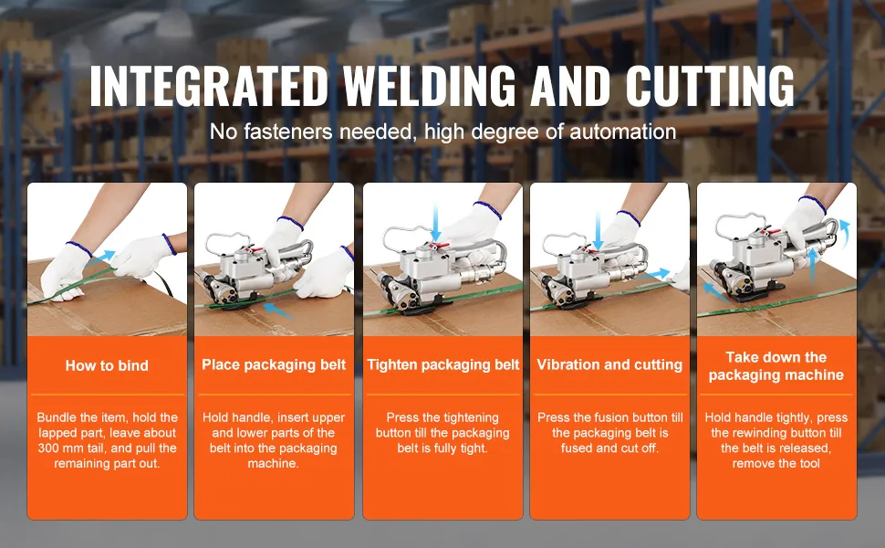 Questa reggiatrice portatile è progettata per migliorare l'efficienza delle tue operazioni. Riduce la necessità di manodopera, risparmiando tempo e fatica. Il design ergonomico dell'utensile consente una facile maneggevolezza, rendendolo comodo da usare per lunghi periodi. Ciò significa che puoi fissare i carichi più velocemente rispetto ai metodi manuali. Ciò significa maggiore produttività e costi di manodopera ridotti. Il design leggero lo rende facile da manovrare e adatto a vari compiti. Riducendo lo sforzo fisico associato alla reggiatura manuale, questo utensile aiuta a prevenire gli infortuni sul posto di lavoro! Nel complesso, questo utensile di reggiatura avanzato aumenta l'efficienza operativa e riduce i costi di manodopera.