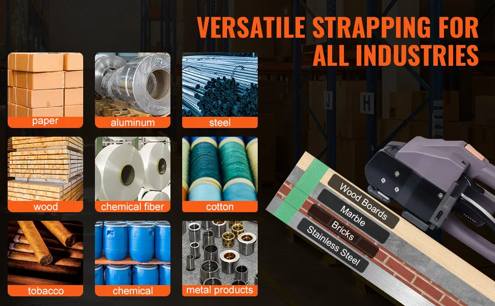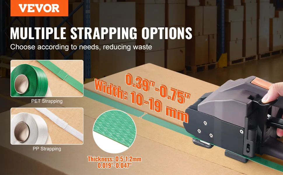 Opzioni di reggiatura versatili: la nostra reggiatrice elettrica funziona perfettamente con reggia in polipropilene (PP) e poliestere (PET). Gestisce larghezze da 0,39 a 0,75 pollici (da 1 a 2 cm) e spessori da 0,02 a 0,05 pollici (da 0,05 a 0,127 cm). Ciò significa che puoi imballare facilmente articoli di diverse dimensioni e pesi e risparmiare sui costi scegliendo il nastro giusto per il lavoro.