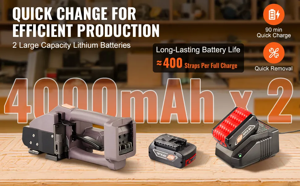 Batteria di grandi dimensioni per una produzione efficiente: questo tendireggia elettrico è alimentato da due batterie al litio da 4000 mAh e consente di eseguire fino a 400 operazioni di reggiatura con una carica completa. Si ricarica rapidamente in soli 90 minuti e ha un design rimovibile per poter sostituire le batterie mentre sei in movimento. Meno tempi di inattività significano più produttività e meno fatica per te.