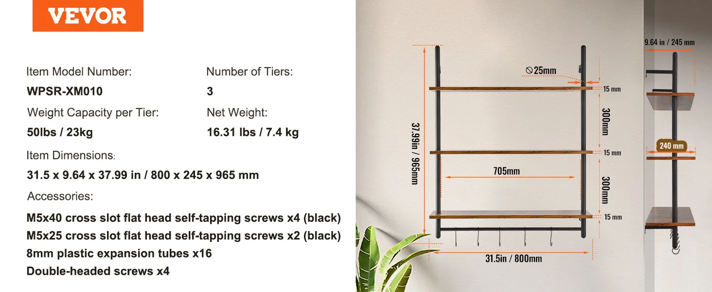 VEVOR Scaffale per Tubi Industriali, 3 Ripiani 800 x 245 mm, Mensole Galleggianti in Legno Rustico da Parete, Supporto per Libreria, Portaoggetti per Cucina, Camera da Letto, Bagno, Soggiorno, Nero