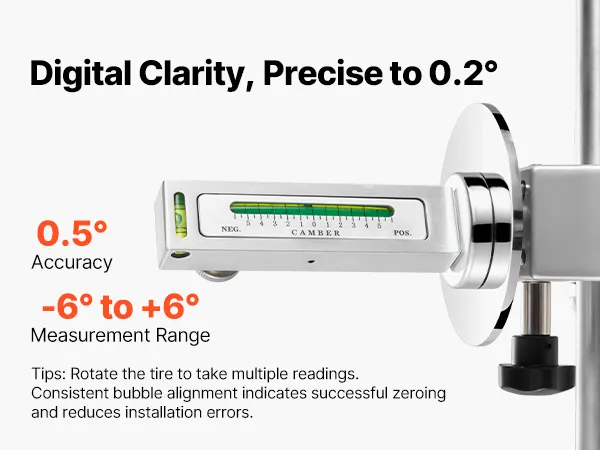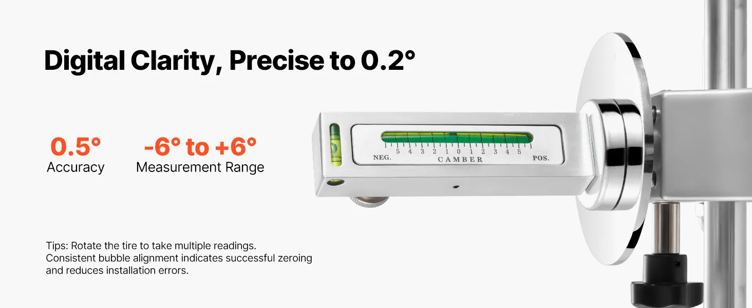 La livella a bolla calibrata di questo strumento per l'allineamento delle ruote fornisce letture chiare e affidabili con una precisione di 0,5°. Una robusta base magnetica mantiene la livella saldamente in posizione, consentendo test di campanatura uniformi.