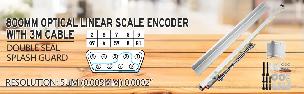 La scala lineare applica un chip intelligente con lunghezza della corsa 0-800 mm, alta precisione 5 um, passo reticolo: 0,02 mm, velocità di risposta: 60 m/min. Connettore: connettore a 9 pin (Pin-26789), da 2 a 0 V, da 6 a A, da 7 a 5 V, da 8 a B, da 9 a R1.