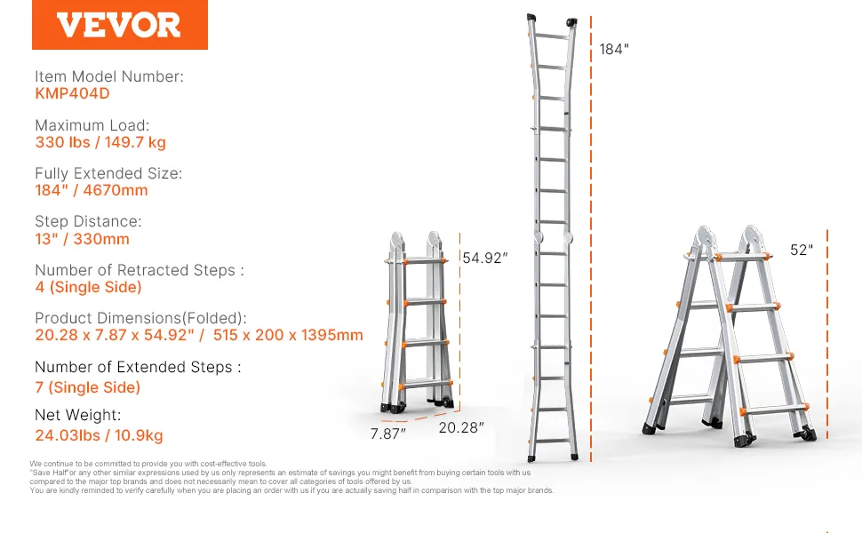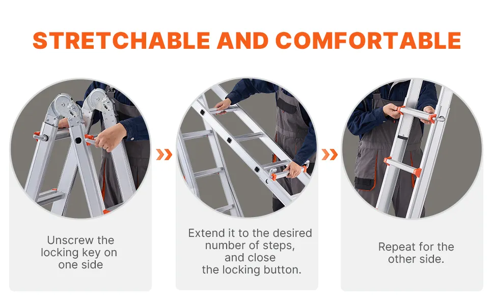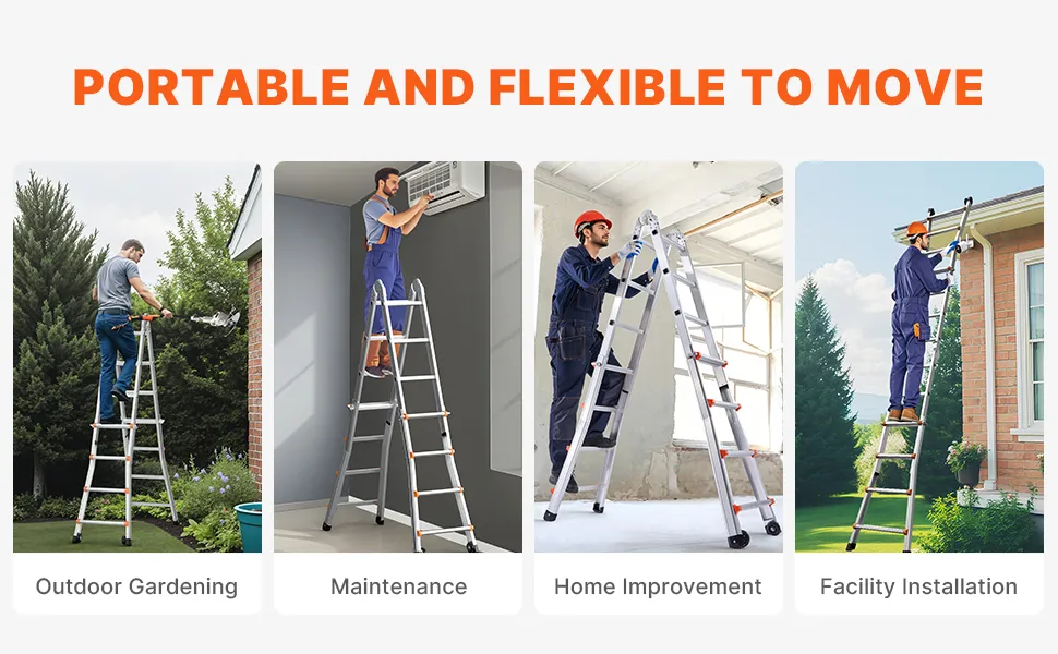 Questa versatile scala allungabile a forma di A può essere ampliata e ridotta in più configurazioni per soddisfare vari requisiti di altezza, rendendola adatta a diversi scenari.