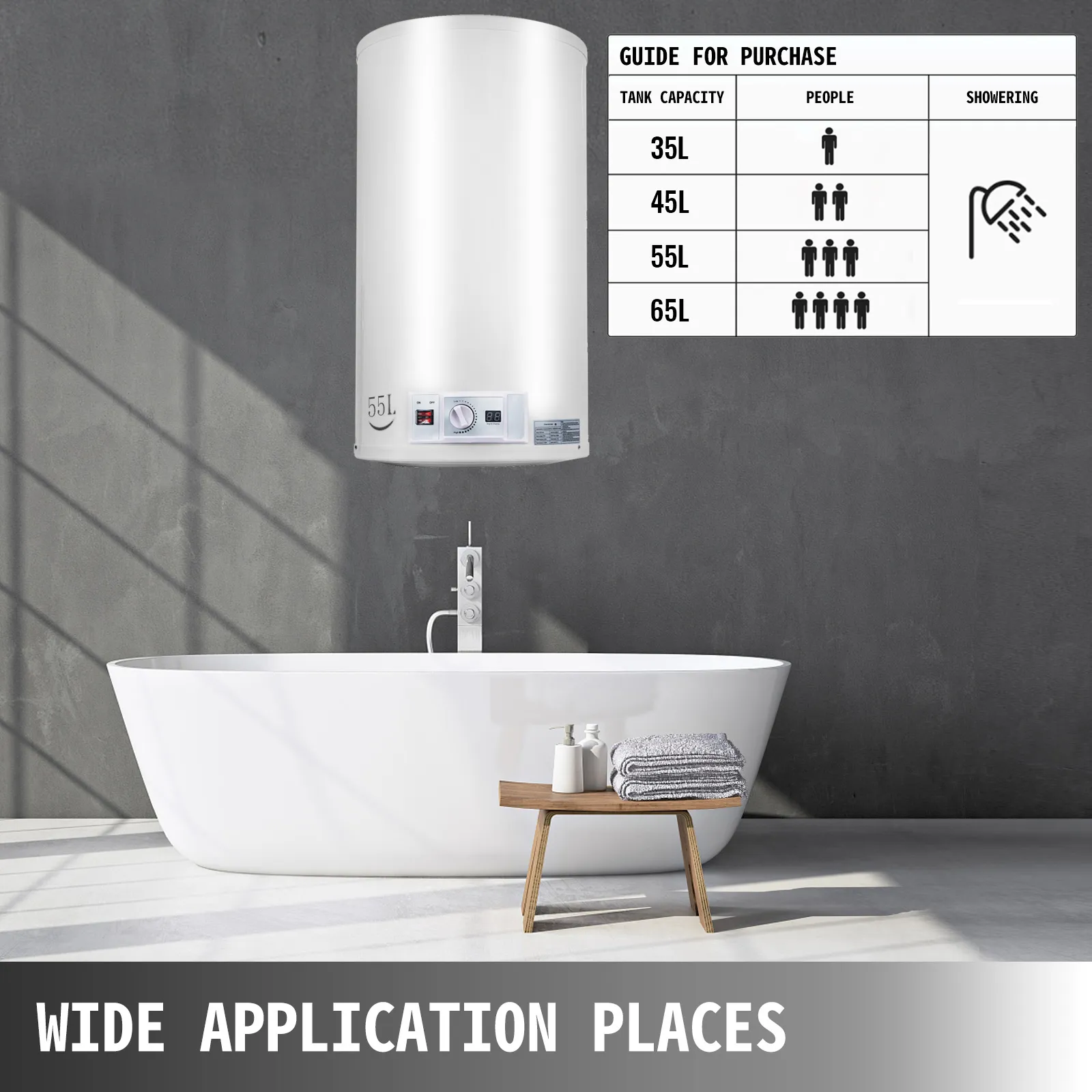 Lo scaldacqua elettrico può fornire in modo rapido ed efficiente fino a 55 litri di acqua calda per lavarsi o fare il bagno in qualsiasi momento. Buon isolamento termico, nessuno spreco di calore, risparmia elettricità ed energia per te. Regola facilmente la temperatura dell'acqua tra 30-75℃. Inoltre sono dotati di accessori, come soffione doccia (con tubo), rubinetto lavabo, valvola di sicurezza. Un elettrodomestico indispensabile per la tua stanza.