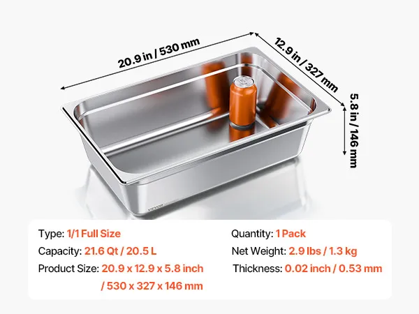 Questa teglia per la cottura a vapore è realizzata in acciaio inossidabile SS201 calibro 22 di qualità commerciale, che offre robustezza e resistenza alla ruggine. La teglia da 1/1 di dimensione standard, profonda 15 cm e disponibile in confezione singola, soddisfa le esigenze di cottura quotidiane.
