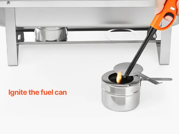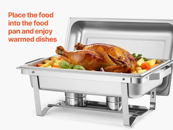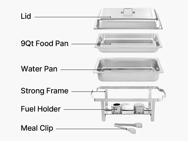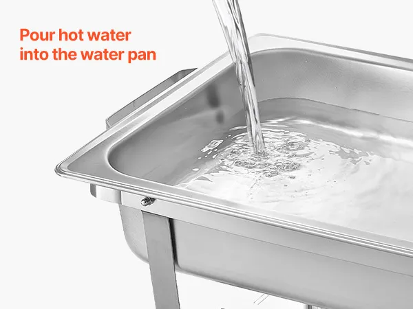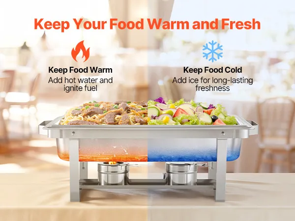 Riscaldamento flessibile: servi facilmente cibi caldi o freddi con il nostro supporto per chafing pan per catering. I contenitori per il combustibile mantengono il cibo caldo, mentre il vassoio per l'acqua contiene il ghiaccio per raffreddarlo