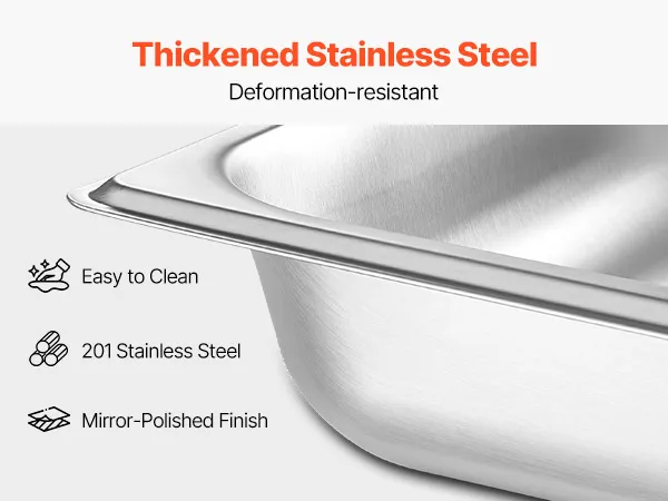 Robusto design in acciaio inox: questo set da 9 QT (8,5 L), realizzato in acciaio inox SS201, unisce robustezza a un'elegante finitura lucida. Conserva in modo efficiente cibi caldi e freddi e valorizza le presentazioni dei buffet