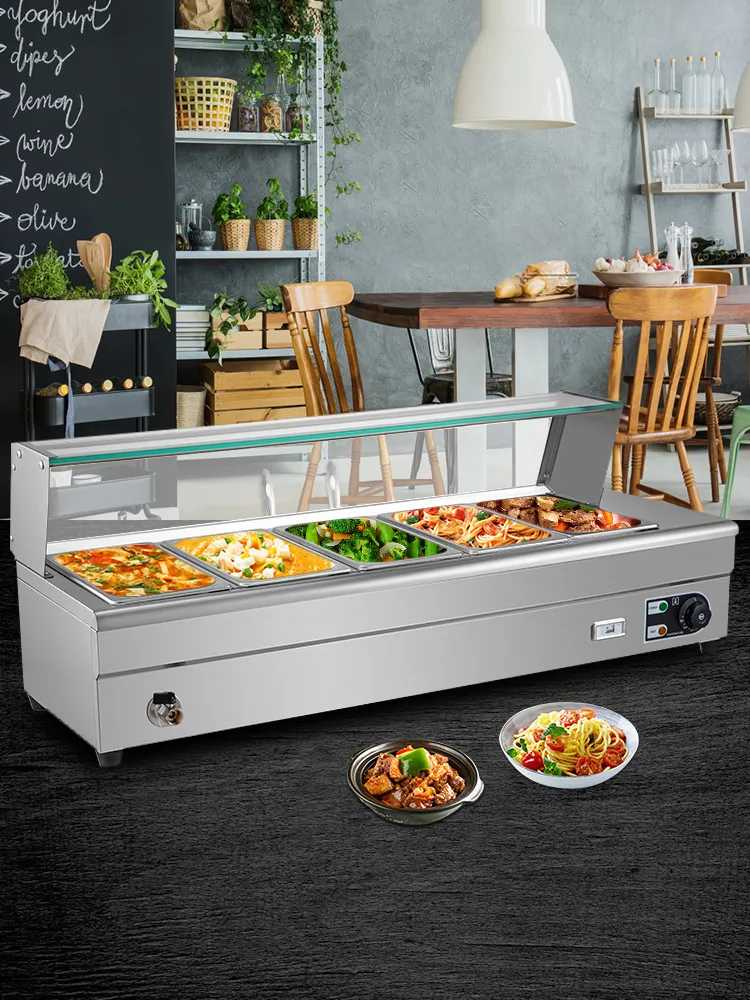 Il nostro scaldavivande a buffet è dotato di uno schermo in vetro temperato rimovibile, spessore 0,3 pollici (8 mm). Attraverso lo schermo di vetro, lo stato del cibo può essere osservato direttamente, garantendo allo stesso tempo l'igiene degli alimenti.