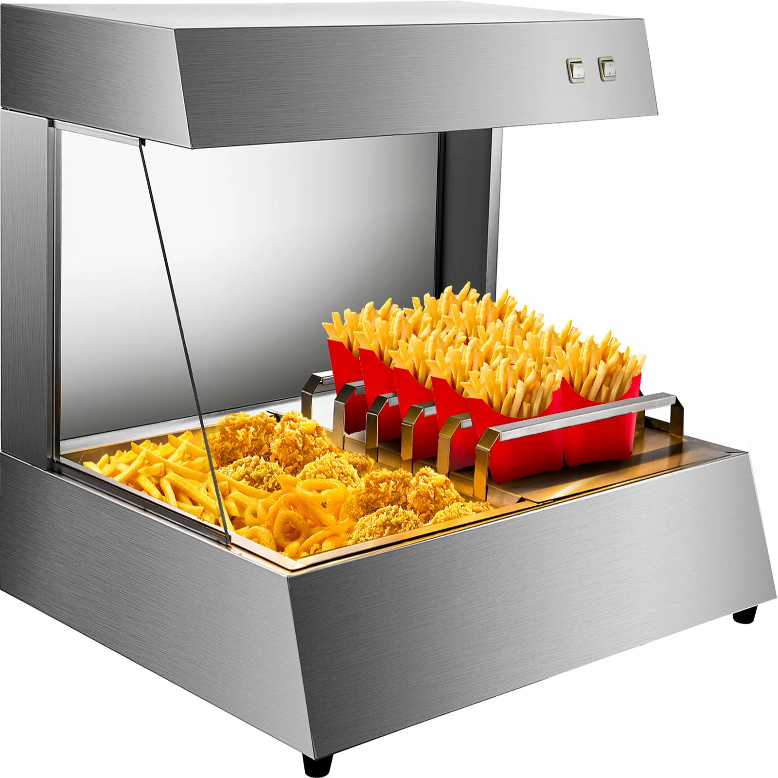 La nostra stazione scaldavivande è progettata per essere posizionata accanto a una friggitrice per mantenere caldi i cibi fritti per servire. I tubi riscaldanti riscaldano efficacemente i cibi senza continuare a cuocerli e due lampadine illuminano la stazione più calda per evidenziare patatine fritte croccanti e bollenti, anelli di cipolla, strisce di pollo, ecc. Funziona perfettamente per la caffetteria, club e bar, concessioni, ristoranti e caffè e supermercati e gastronomie.