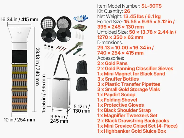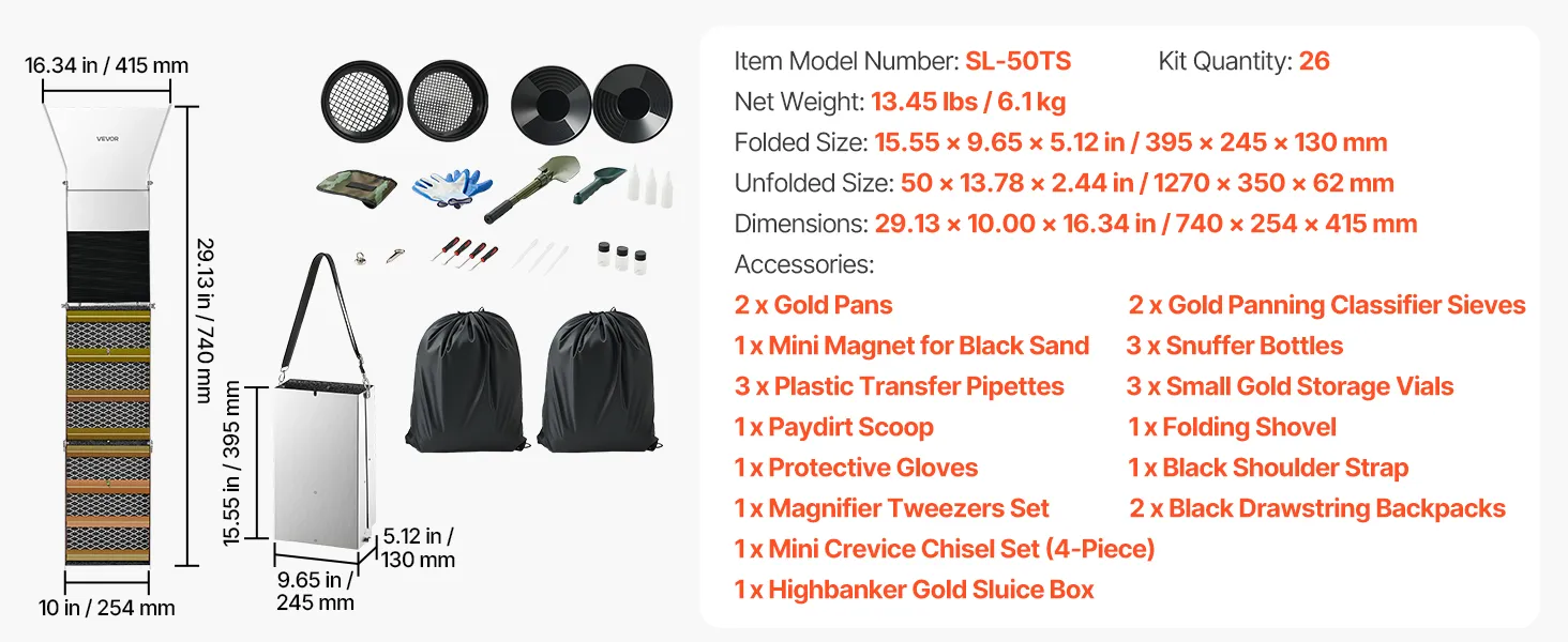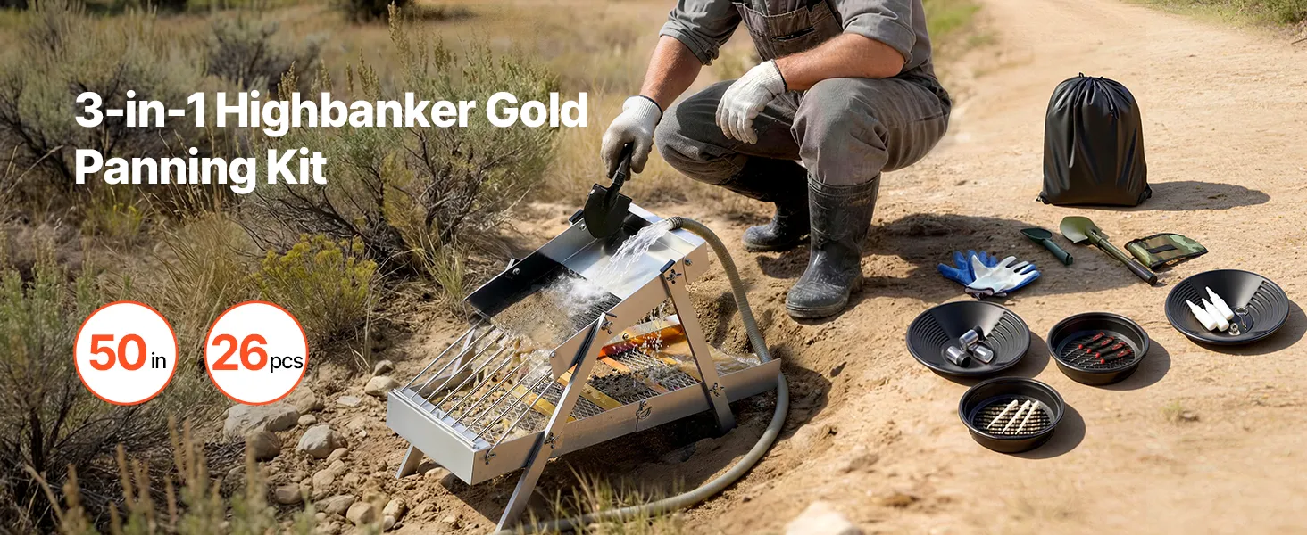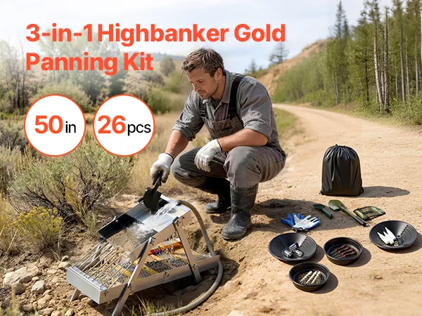 VEVOR Kit per Ricerca dell'Oro Highbanker Pieghevole 3 in 1 da 1270mm, Kit di Prospezione Classificazione Oro Attrezzature Minerarie Portatili da 26pz con Setacci Oro Magneti Zaino e Altri Accessori