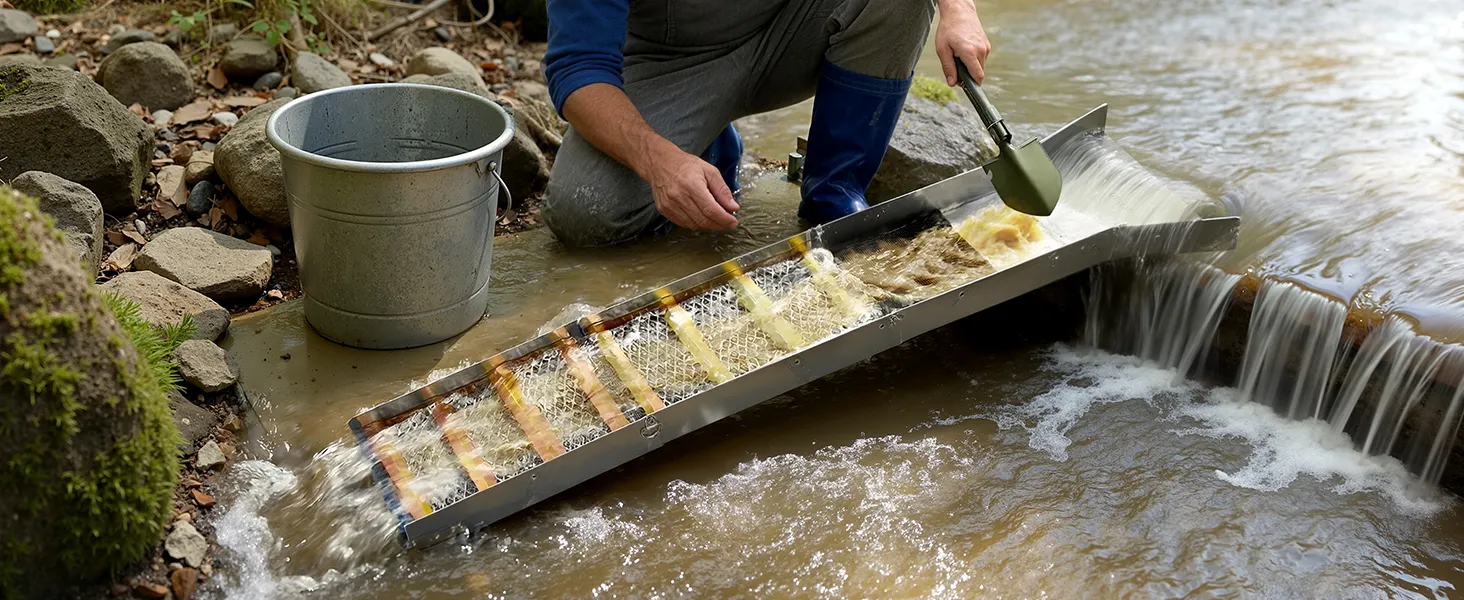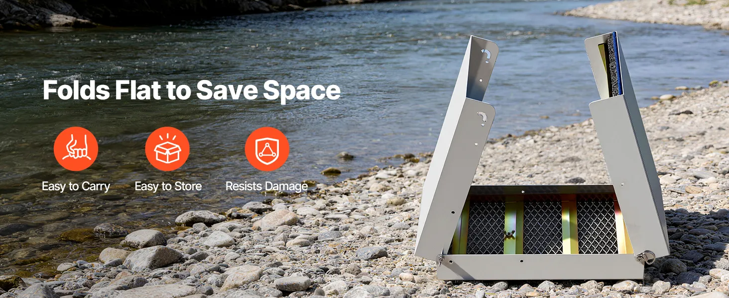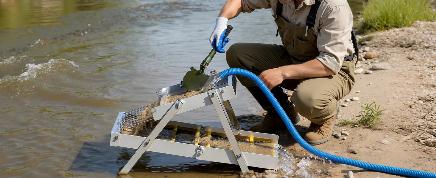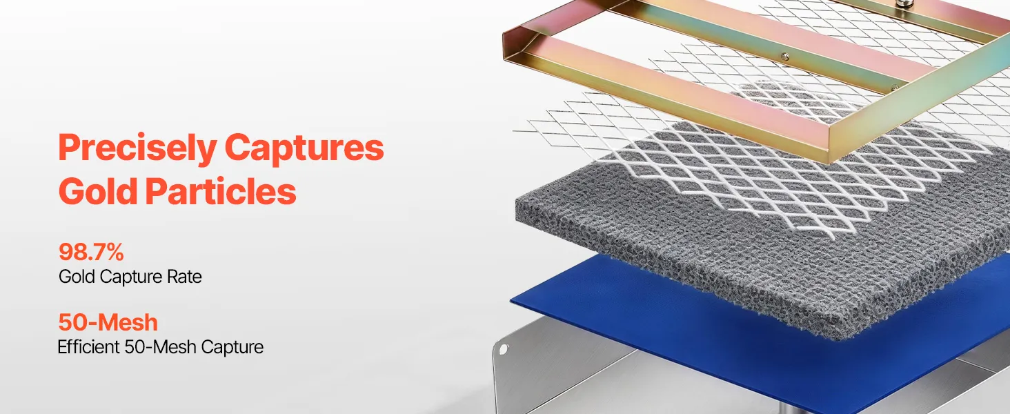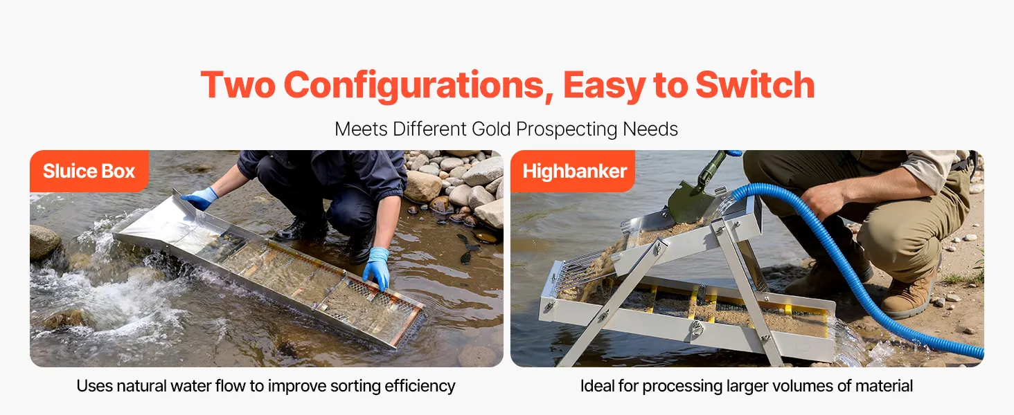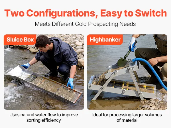 Doppia modalità High Banker Gold Sluice: Passa manualmente dalla modalità Sluice alla configurazione High Banker. La modalità High Banker gestisce in modo efficiente lotti più grandi, mentre la modalità Sluice è adatta ad acque poco profonde e piccoli corsi d'acqua, soddisfacendo diverse esigenze