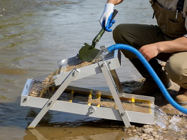 Il setaccio classificatore nel kit della chiusa Highbanker separa rapidamente ghiaia e detriti di grandi dimensioni, consentendo di concentrarsi sulla sabbia fine e aurifera e di migliorare l'efficienza della setacciatura.