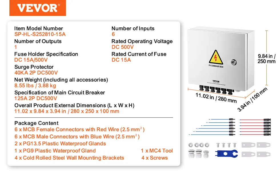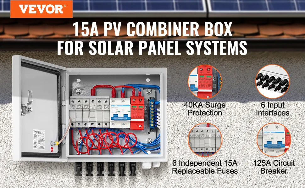 La scatola combinatrice solare FV VEVOR include un fusibile da 15 A e un interruttore automatico da 125 A. Ciò garantisce prestazioni affidabili e protegge i pannelli solari. Il fusibile da 15 A aiuta a prevenire cortocircuiti e sovraccarichi. Inoltre, l'interruttore automatico fornisce una protezione aggiuntiva per la configurazione solare. Ciò la rende una scelta affidabile per tutte le esigenze solari. Una protezione avanzata prolunga la durata dei pannelli; puoi affidarti alla scatola VEVOR per mantenere il tuo sistema sicuro ed efficiente.