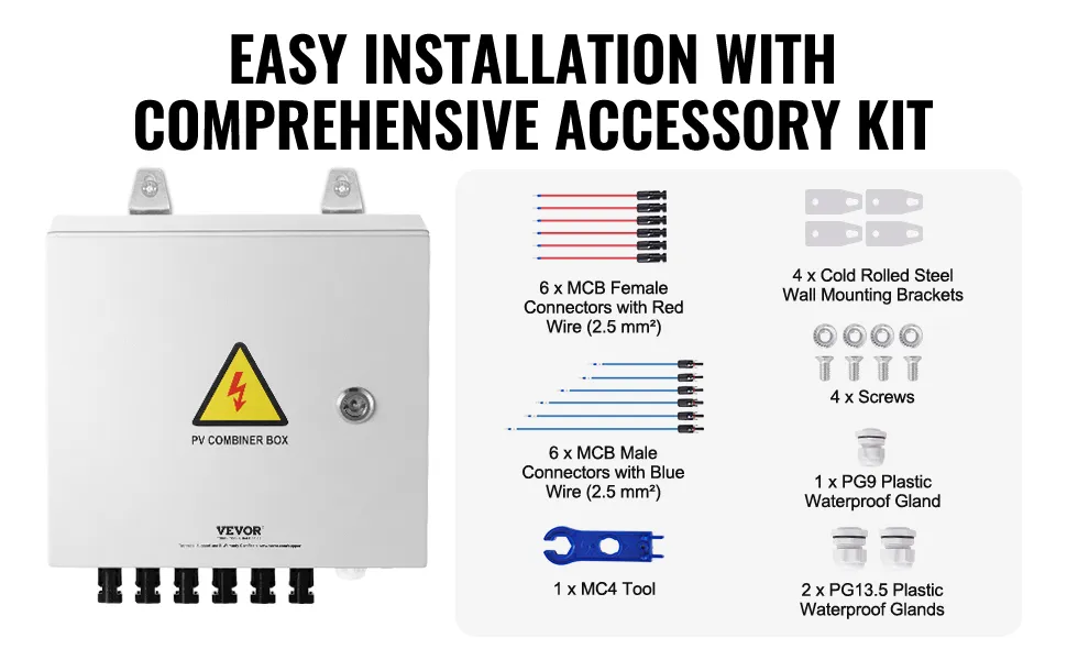 La nostra scatola combinata fotovoltaica viene fornita con un set completo di accessori di installazione, che semplificano il montaggio e l'integrazione nel tuo sistema di pannelli solari, garantendo connessioni senza interruzioni e installazione senza problemi.