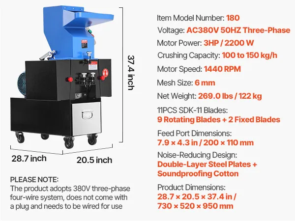 Triturazione multifunzionale: questo trituratore di plastica è dotato di un motore in rame puro da 3 CV (2,2 kW). (NOTA: il prodotto adotta un sistema trifase a quattro fili da 380 V, non è dotato di spina e necessita di cablaggio per l'uso)