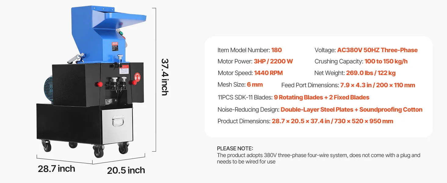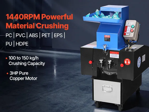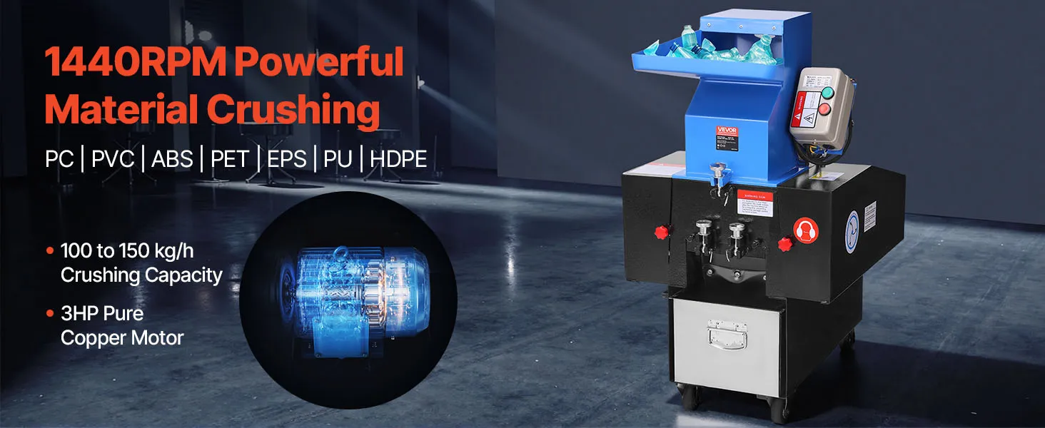 Il trituratore di plastica VEVOR è dotato di un motore in rame puro da 3 CV, con una capacità di frantumazione di 100-150 kg/h.