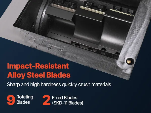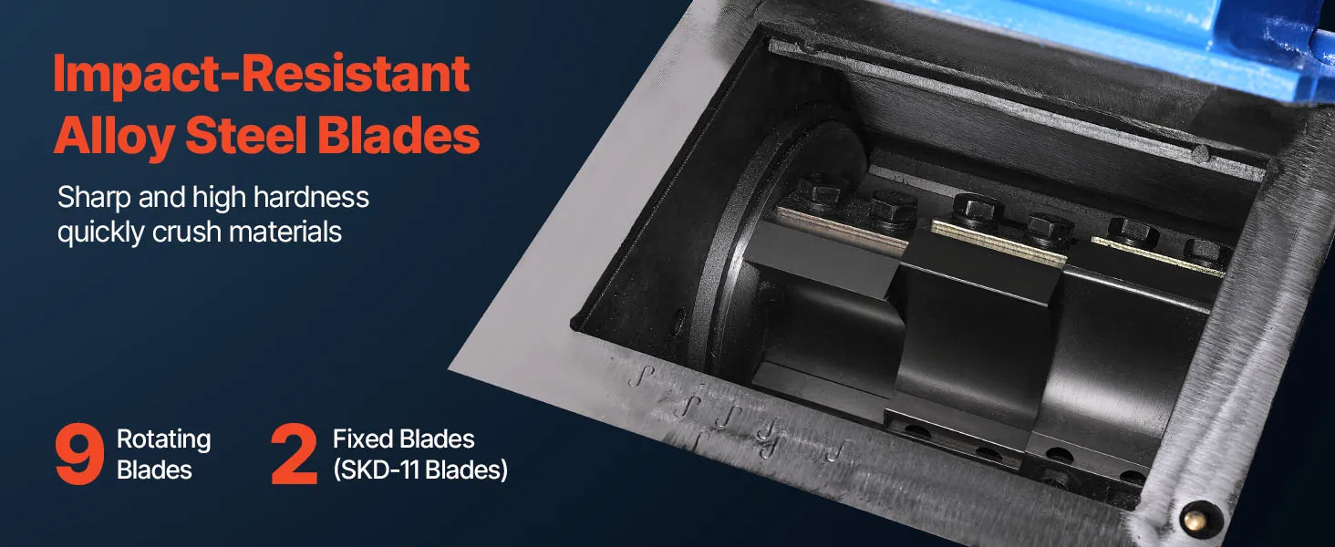 Lame affilate in acciaio legato: Il nostro trituratore per plastica trifase da 380 V è dotato di 11 lame SKD-11 (9 rotanti + 2 fisse) in acciaio legato resistente agli urti. Nota: evitare di triturare vetro o metallo per non danneggiare le lame