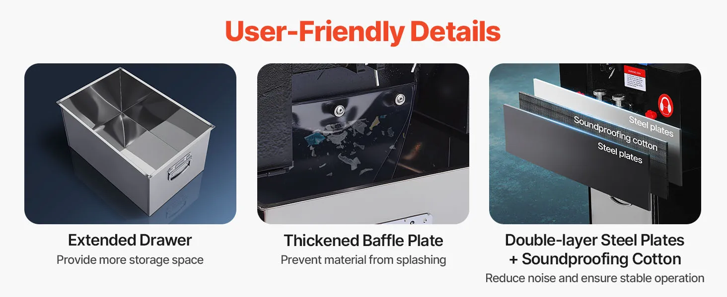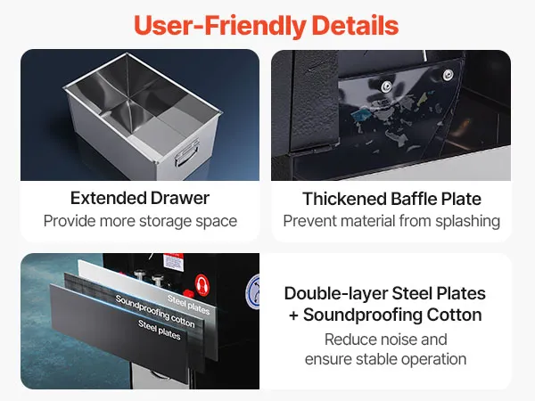 Il cassetto allungabile offre ulteriore spazio di archiviazione, mentre la piastra deflettrice spessa evita efficacemente gli schizzi di materiale.