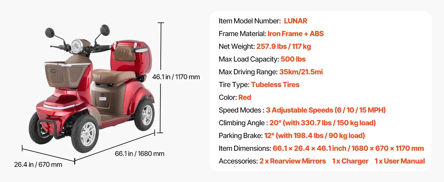 VEVOR Scooter Elettrico 4 Ruote per Disabili Anziani 1000W, Scooter Carico max. 226,8 kg, Autonomia 35 km, 3 Modalità di Velocità, Capacità di Salita da 20°, Cestino Portaoggetti