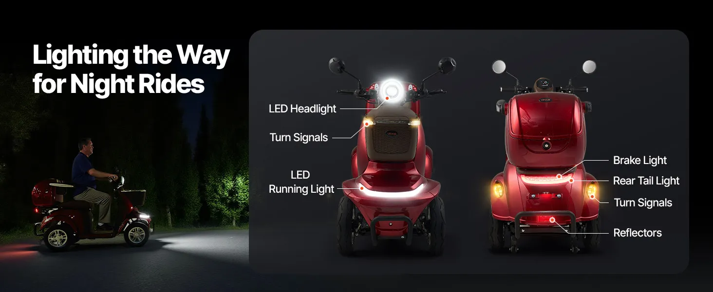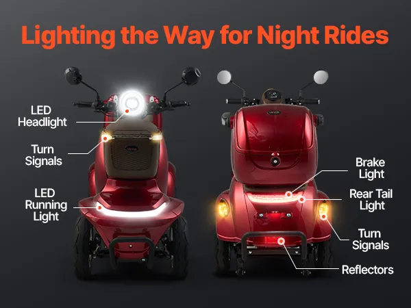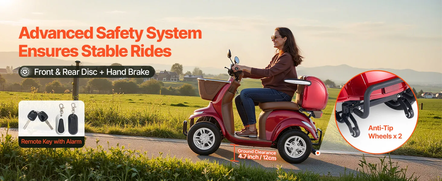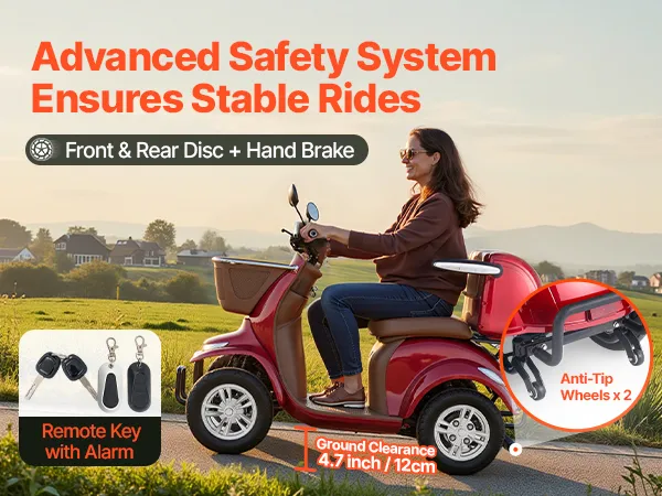 La sicurezza prima di tutto: il nostro scooter elettrico per adulti è dotato di doppi freni anteriori e posteriori per una frenata affidabile. Una ruota posteriore antiribaltamento garantisce stabilità