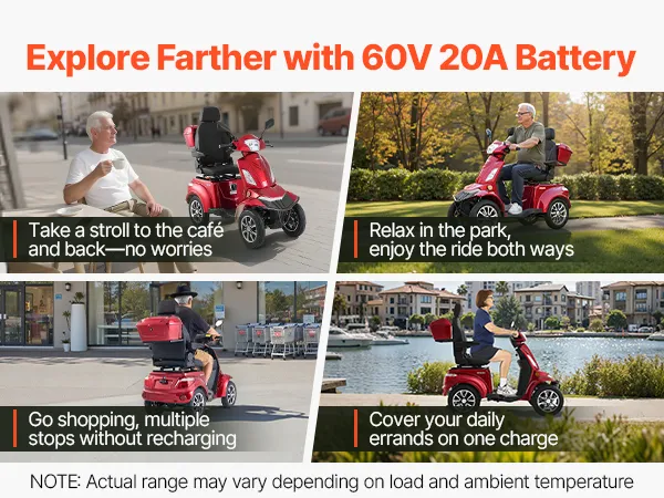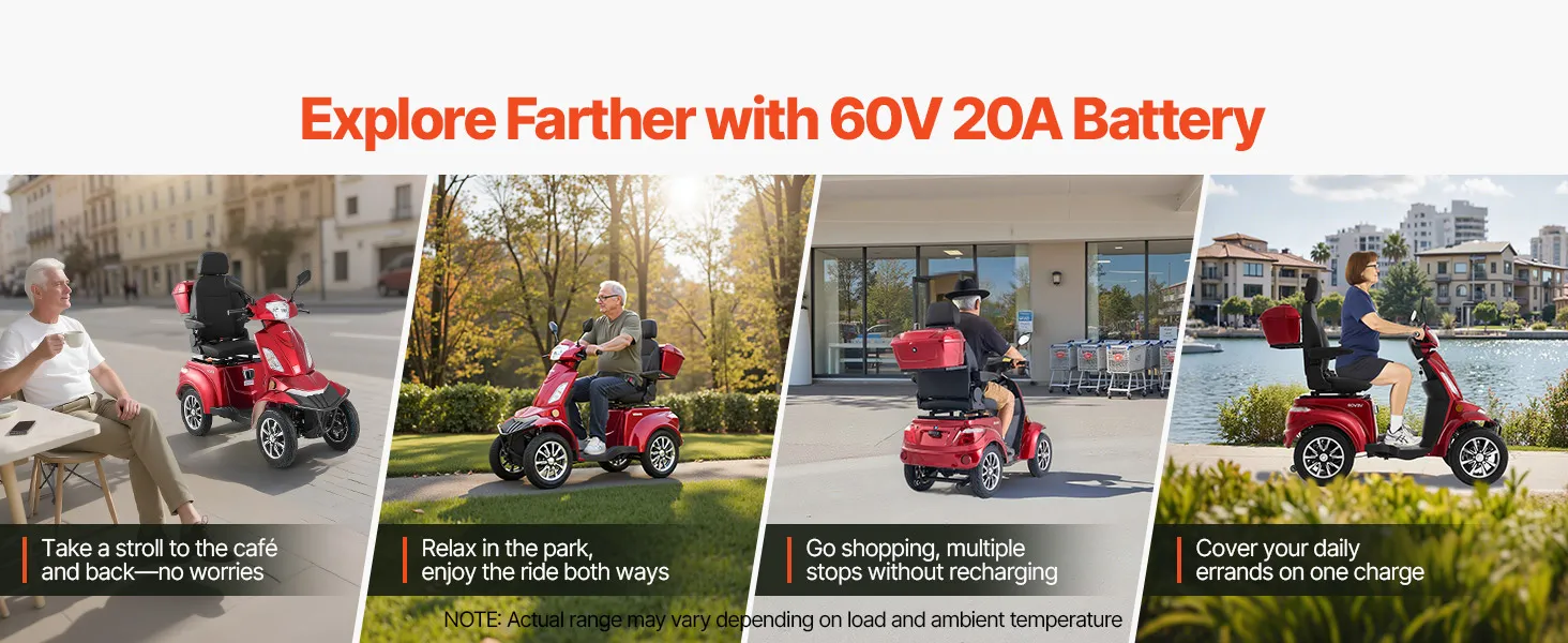 Guida stabile: il nostro scooter elettrico a 4 ruote è alimentato da una batteria al piombo ricaricabile da 60 V 20 A, che offre prestazioni di lunga durata e un'autonomia fino a 35 km per carica completa