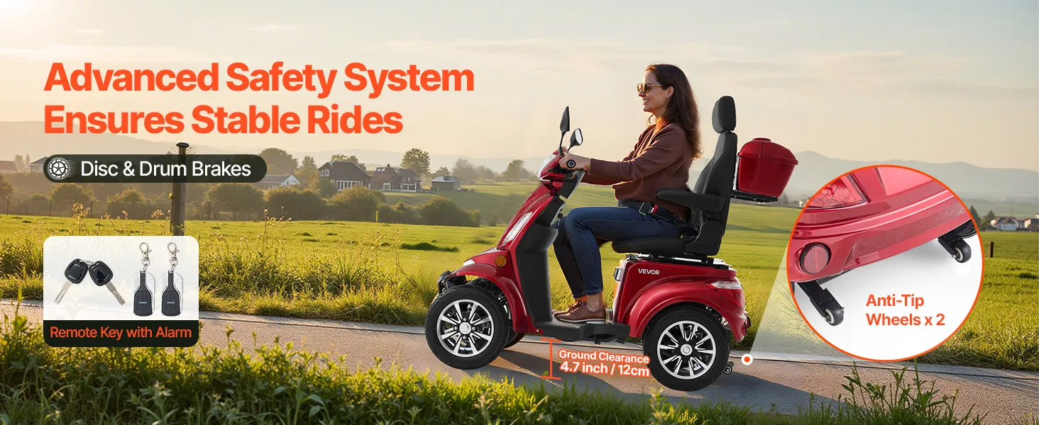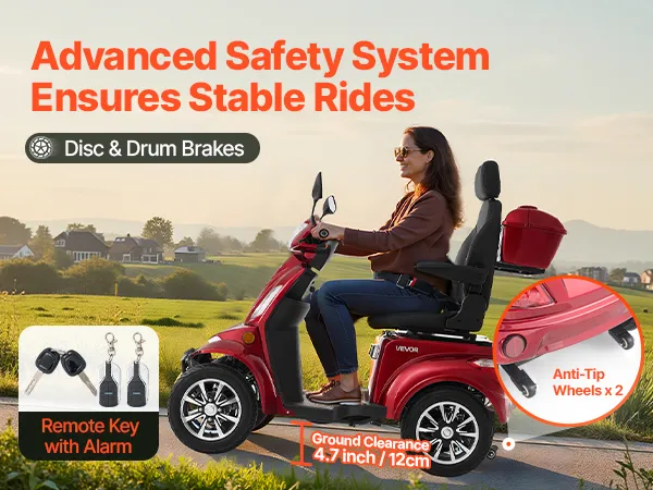 La sicurezza prima di tutto: il nostro scooter elettrico per adulti è dotato di doppi freni anteriori e posteriori per una frenata affidabile. Una ruota posteriore antiribaltamento garantisce la stabilità