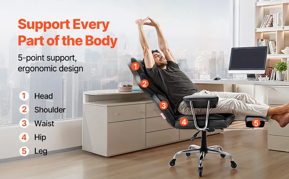 Dotato di funzione basculante, abbinato a un poggiapiedi regolabile e braccioli spessi, ti offre il luogo perfetto per rilassarti durante le pause di lavoro. Ciò riduce la pressione sulle braccia e sulla schiena, aumentando la produttività e il comfort.