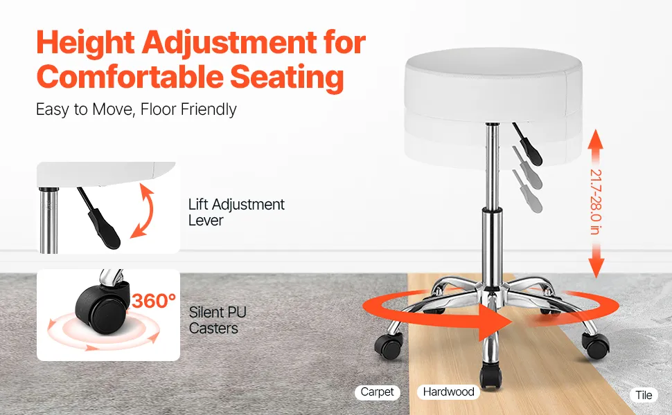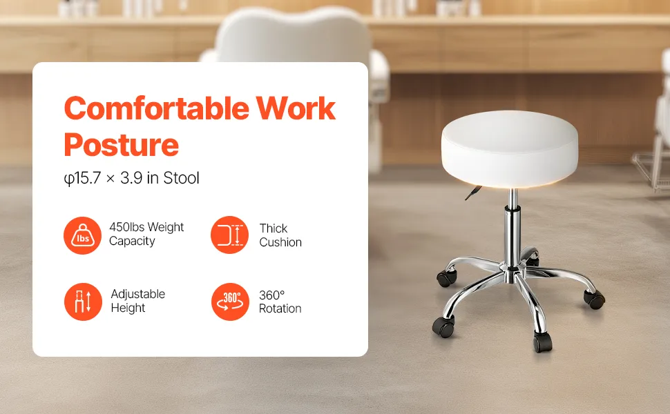 Questo sgabello rotondo con rotelle ha un cuscino spesso di 3,9 pollici per il comfort, supporta fino a 450 libbre con un sollevatore idraulico. La sua altezza regolabile e la rotazione a 360° lo rendono ideale per cliniche, saloni e laboratori.