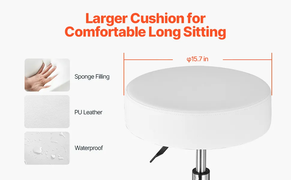 Cuscino spesso: realizzato in schiuma compressa ad alta densità, questo sgabello rotondo con rotelle presenta una dimensione del cuscino di φ15,7 x 3,9 pollici, con un aumento del 20% dello spessore per un comfort migliorato. La superficie del sedile in pelle è traspirante, durevole, facile da pulire e resistente a deformazioni o scolorimento