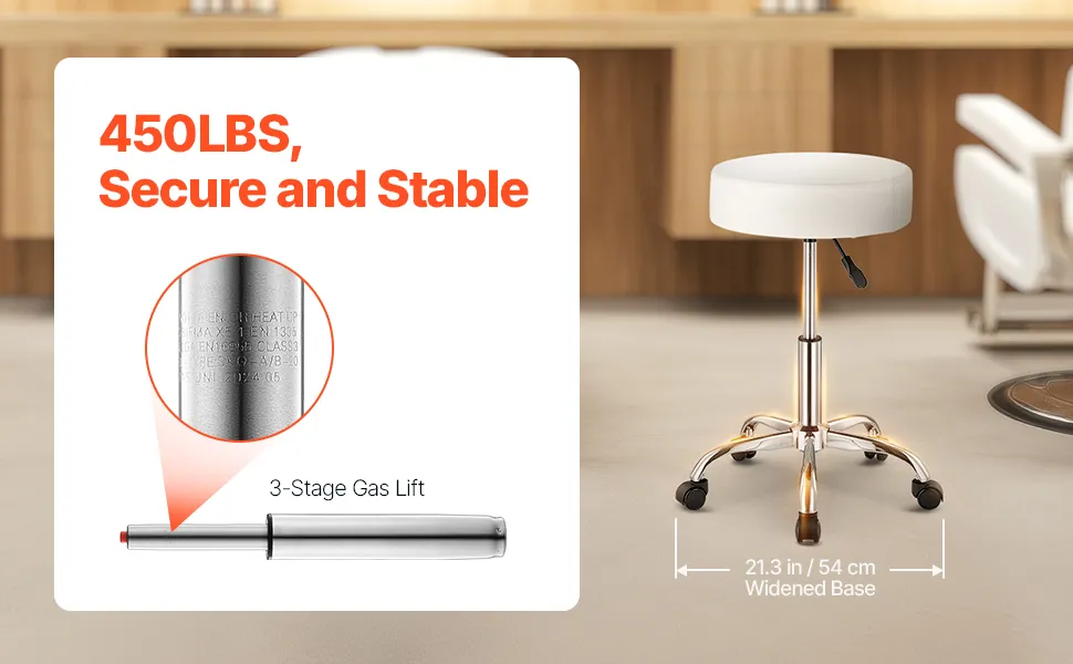 Capacità di peso di 450 libbre: la base dello sgabello rotondo è allargata a 21,3 pollici / 54,9 cm, con una robusta struttura in metallo che supporta fino a 450 libbre. State tranquilli, utilizziamo un sollevatore a gas idraulico a tre stadi, quindi non dovete preoccuparvi della piegatura del metallo