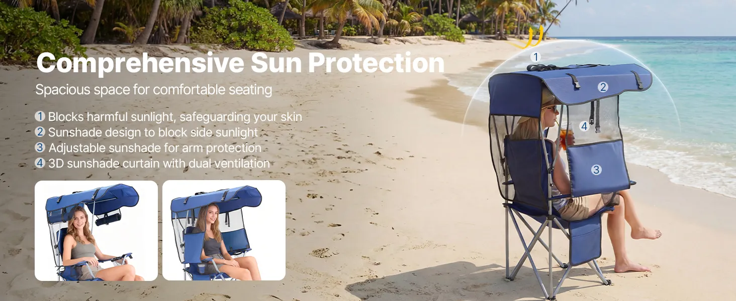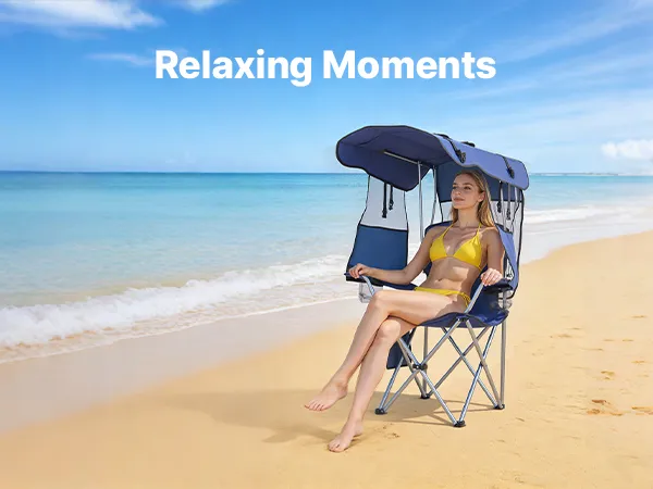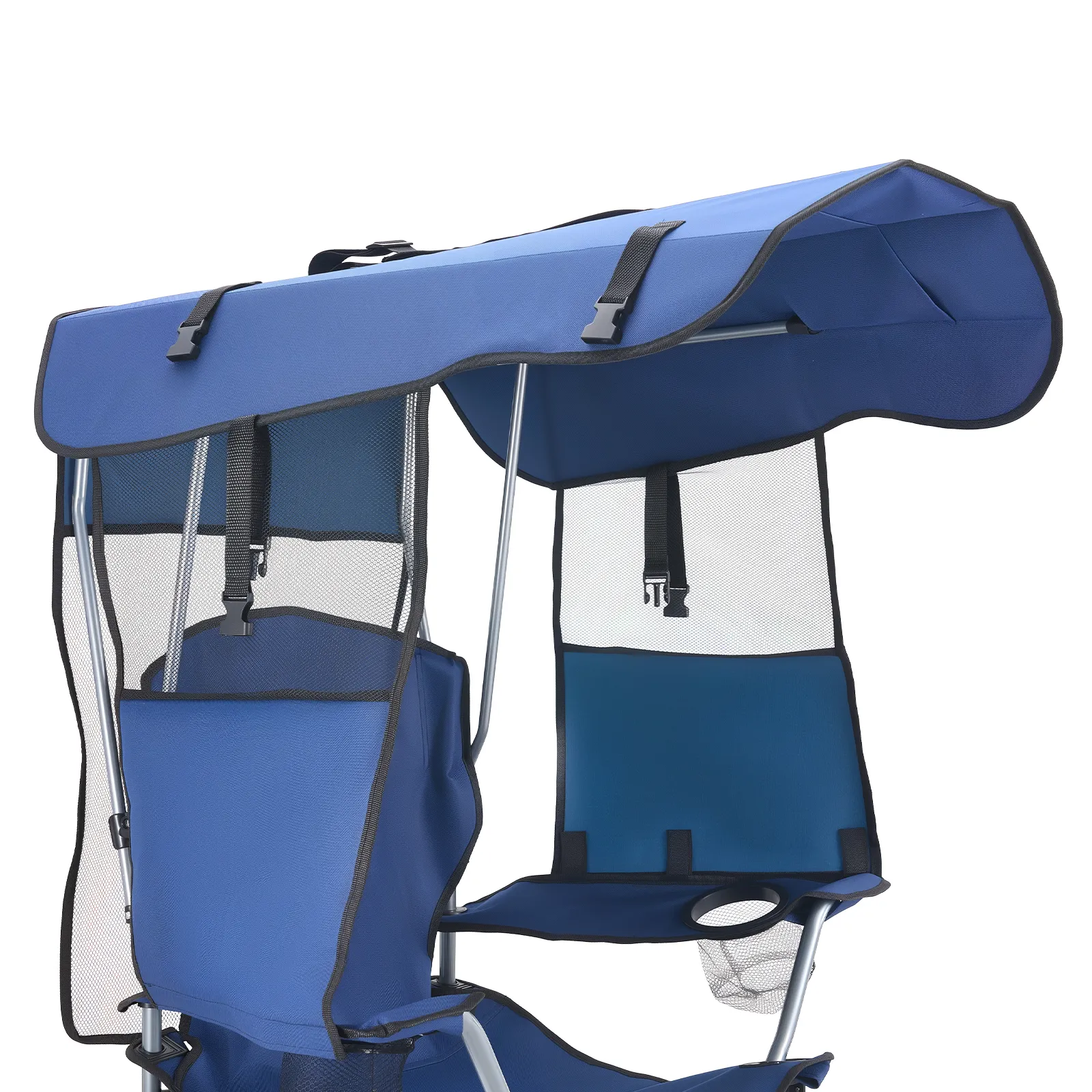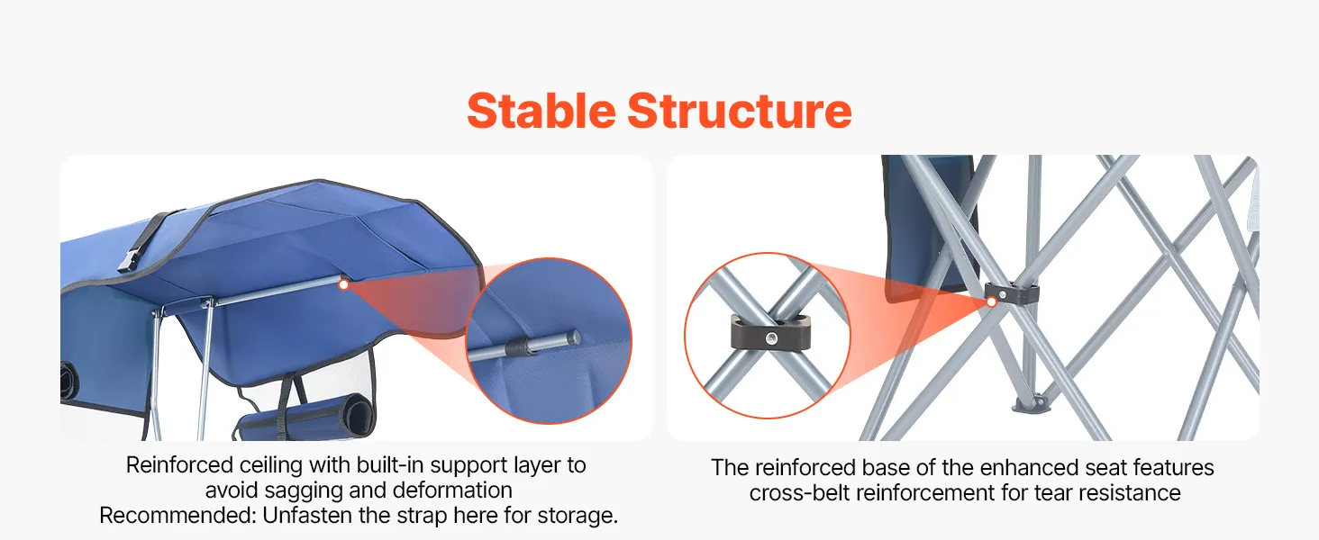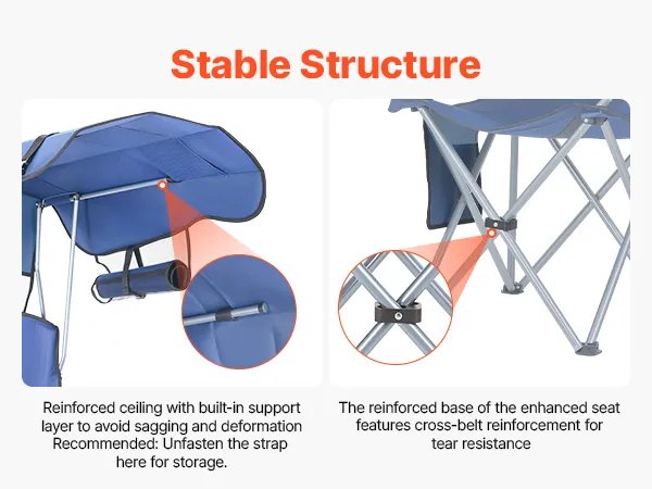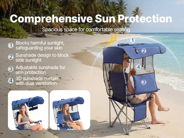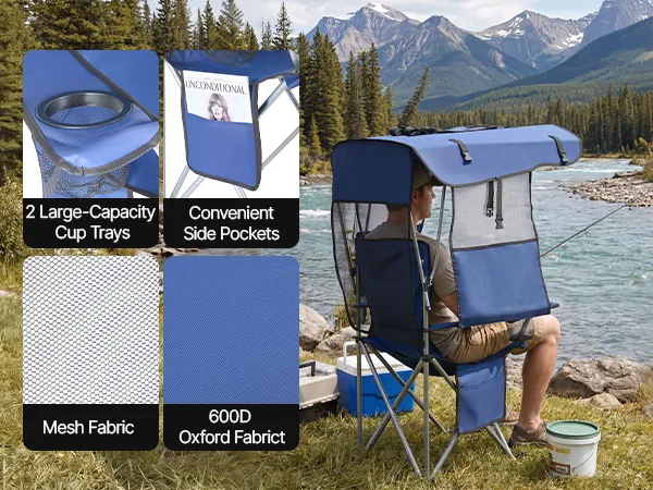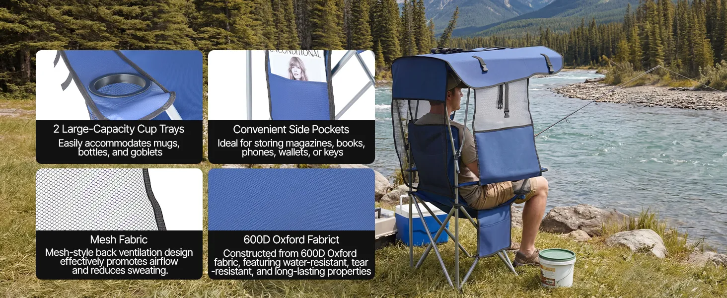 Sistema di protezione solare: Questa sedia da campeggio pieghevole è dotata di un tessuto Oxford 600D regolabile con protezione solare UPF50 per ridurre l'esposizione al sole. Il tubo di supporto in tessuto ha uno spessore di 0,6 mm, ideale per il campeggio e la pesca in pieno sole