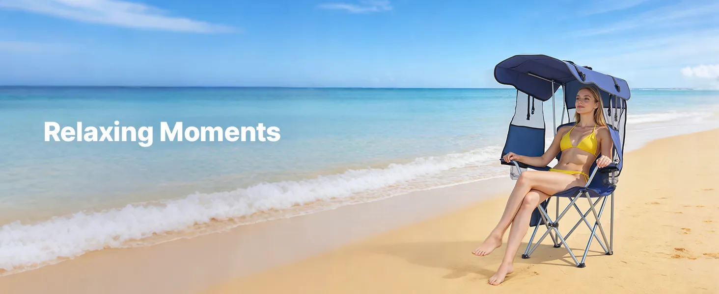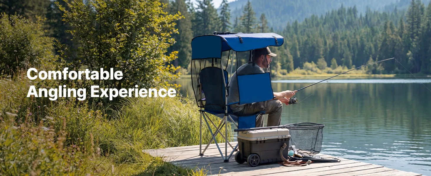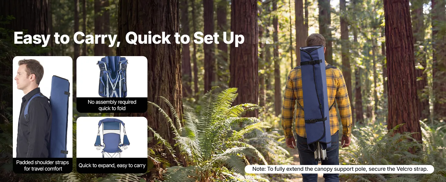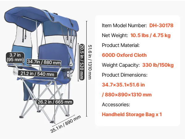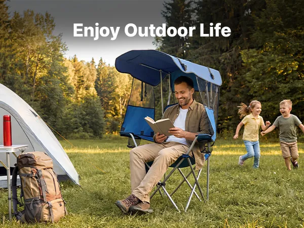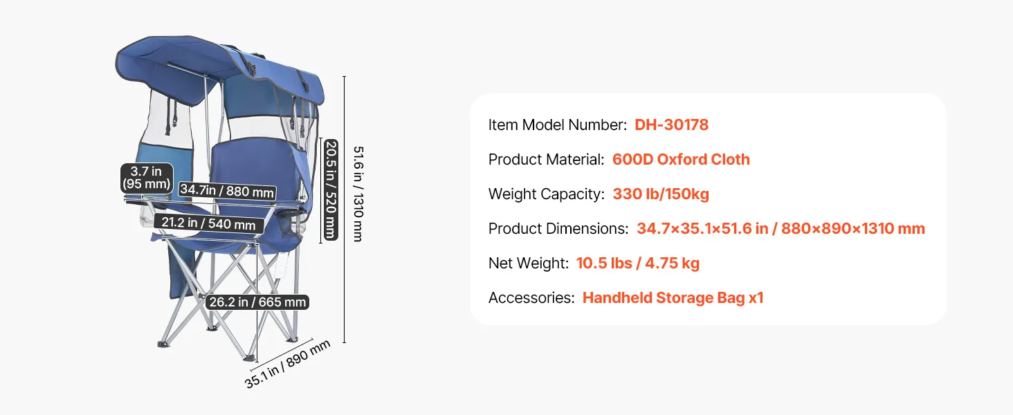 Sistema di protezione solare: Questa sedia da campeggio pieghevole è dotata di un tessuto Oxford 600D regolabile con protezione solare UPF50 per ridurre l'esposizione al sole. Il tubo di supporto in tessuto ha uno spessore di 0,6 mm, ideale per il campeggio e la pesca in pieno sole