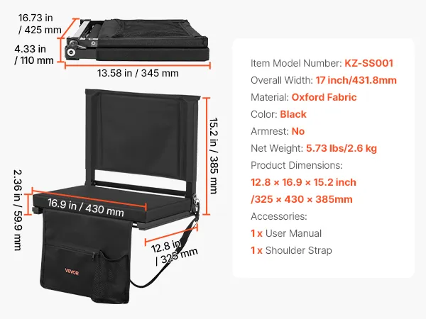 VEVOR Sedia da Stadio Pieghevole con Schienale Seduta Imbottita con Tracolla Sedia da Stadio Larghezza 431,8 mm Sedile a Pavimento per Eventi Sportivi Gancio e Borsa a Rete, Confezione da 1