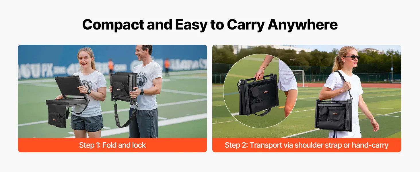 Questo sedile da stadio con schienale è dotato di due spallacci e di una comoda maniglia laterale, offrendo due opzioni di trasporto. Indossalo comodamente sulla schiena per avere le mani libere, oppure utilizza la maniglia laterale ergonomica per un rapido accesso, per un trasporto facile.