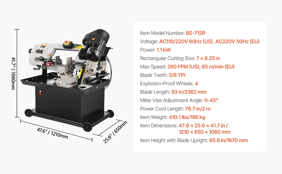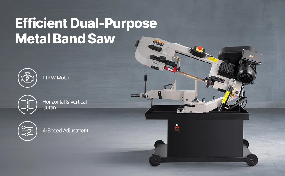 Prestazioni di taglio potenti: la troncatrice a nastro orizzontale in metallo è dotata di un robusto motore da 1,1 kW con una velocità di 1393 giri/min, che fornisce una potenza costante per attività di taglio efficienti