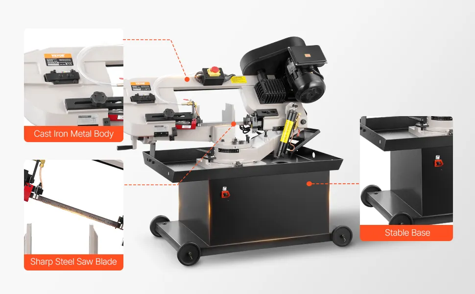Costruita in metallo resistente, questa troncatrice a nastro per il taglio orizzontale/verticale del metallo e la sua lama garantiscono affidabilità a lungo termine. Una base robusta assicura stabilità per tagli precisi.